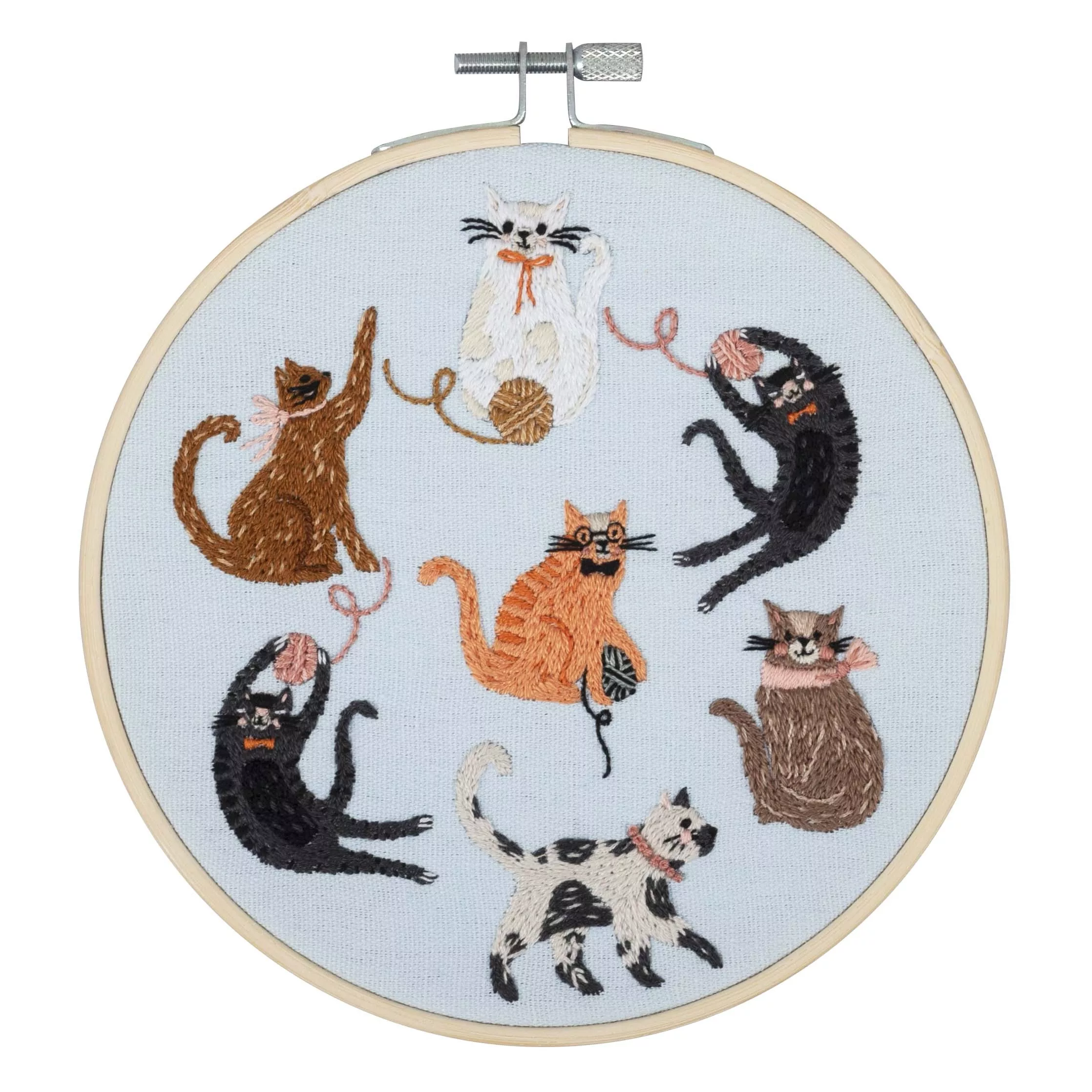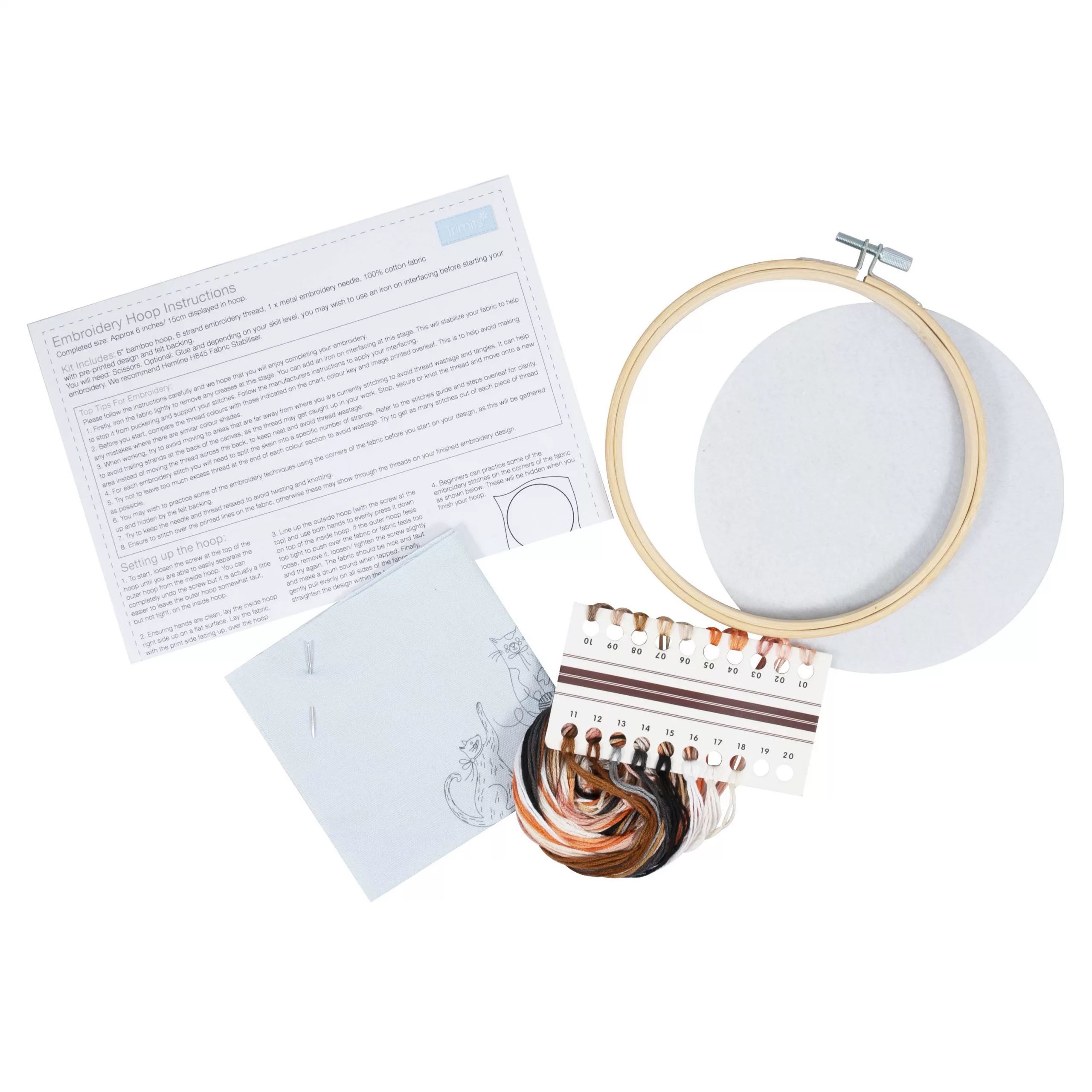 Embroidery kit with hoop. Kit Includes: 15cm bamboo hoop; 6-strand, polyester embroidery threads; 1 x metal embroidery needle; 25 x 25cm cotton fabric with pre-printed design; felt backing and full colour instruction sheet. Instructions in 3 languages (EN/FR/DE). Approximate finished size: (diam) 15cm or 6in