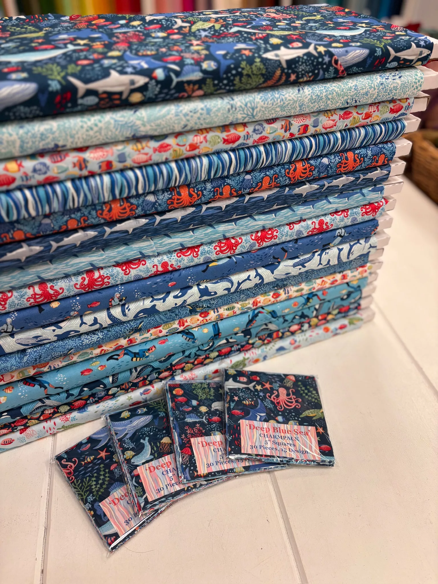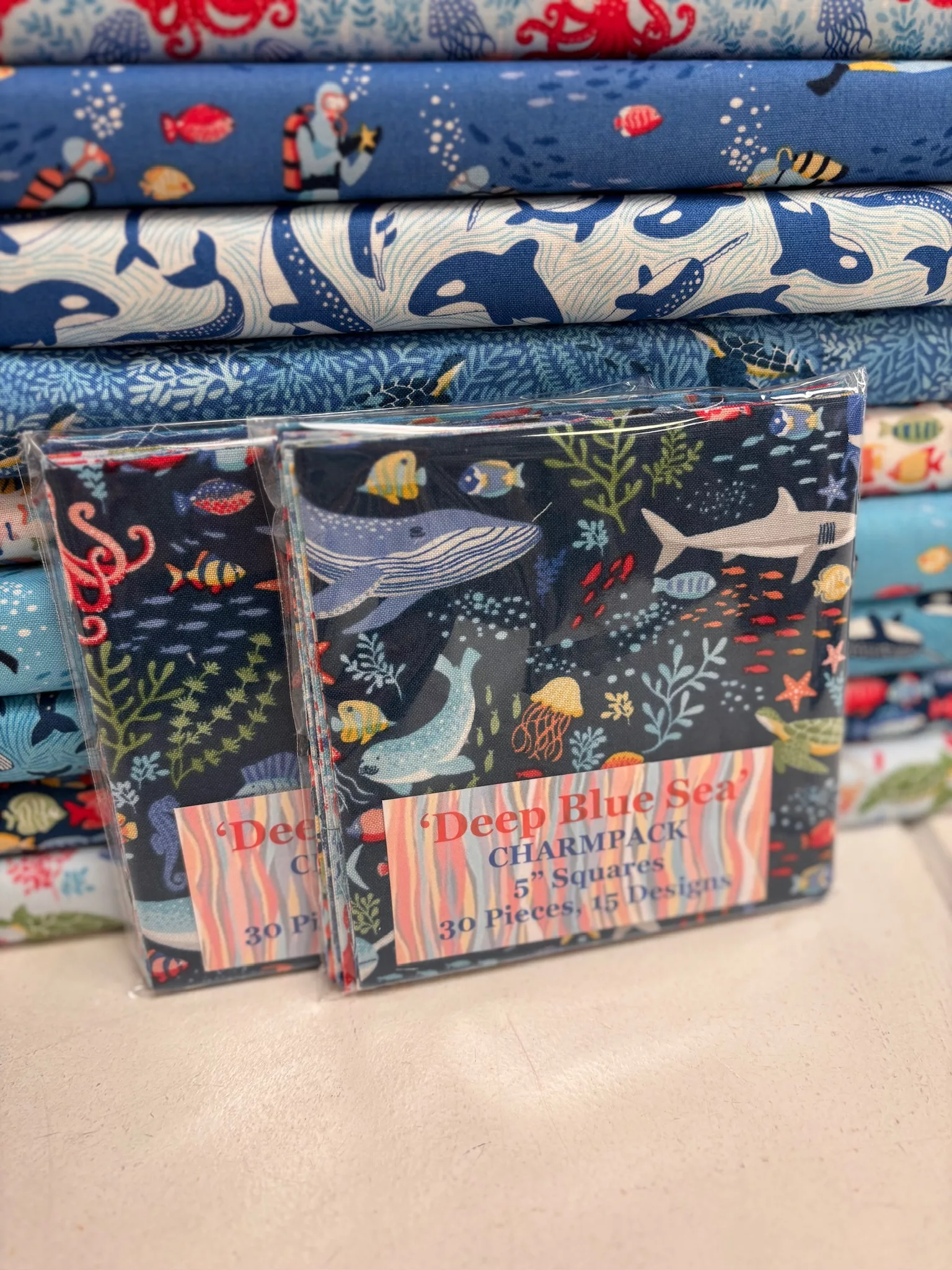 30 pieces, 5 inch squares in 15 different designs from the Deep Blue sea range by Makower.