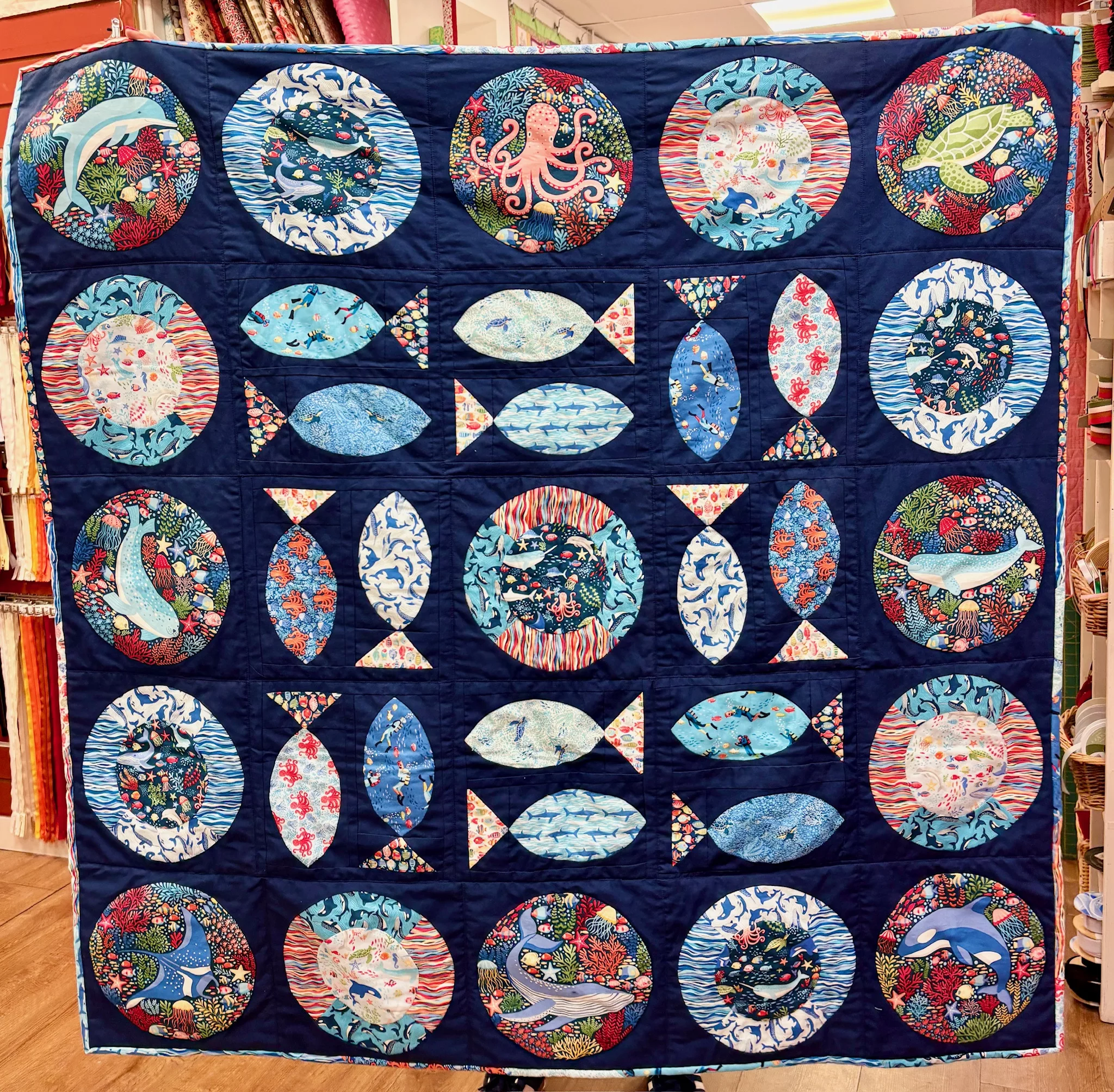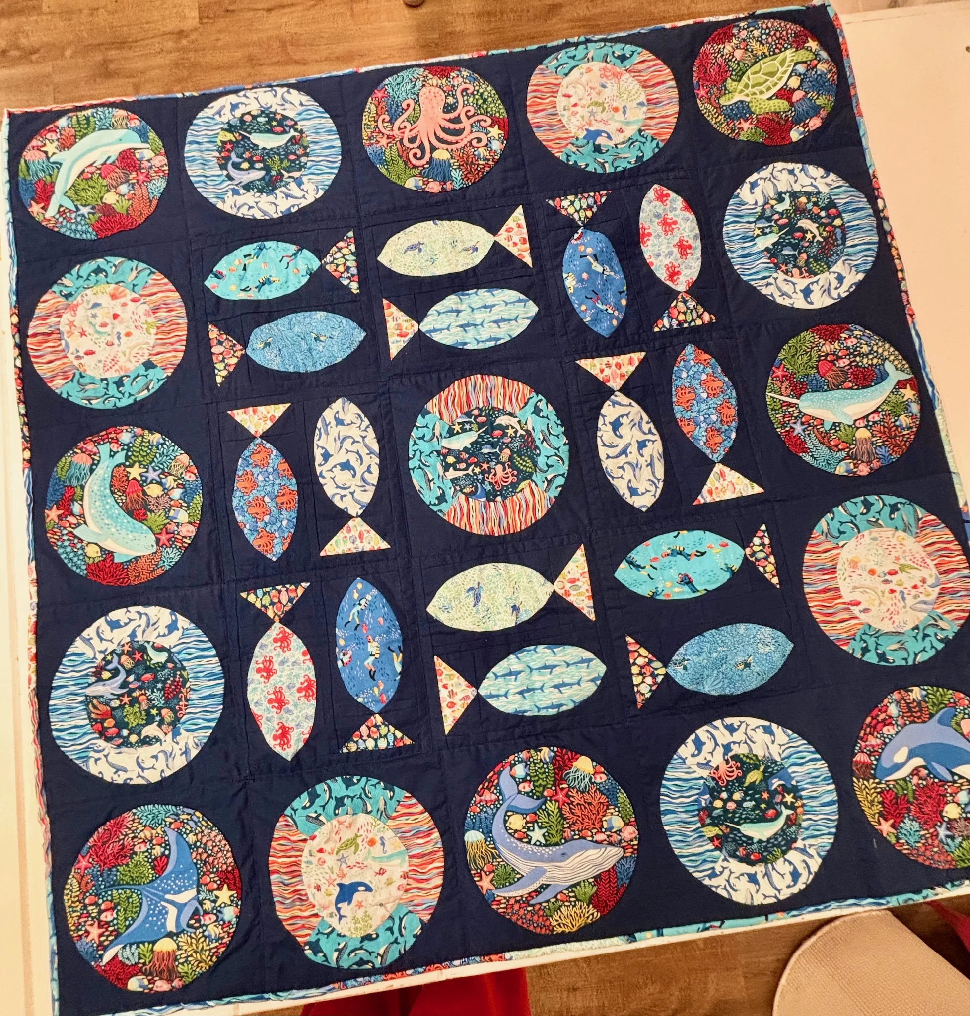 Dive into the deep blue sea with this hand sewn lap quilt. Stitched using an 8 circle panel and templates to create this fish and circles design.
