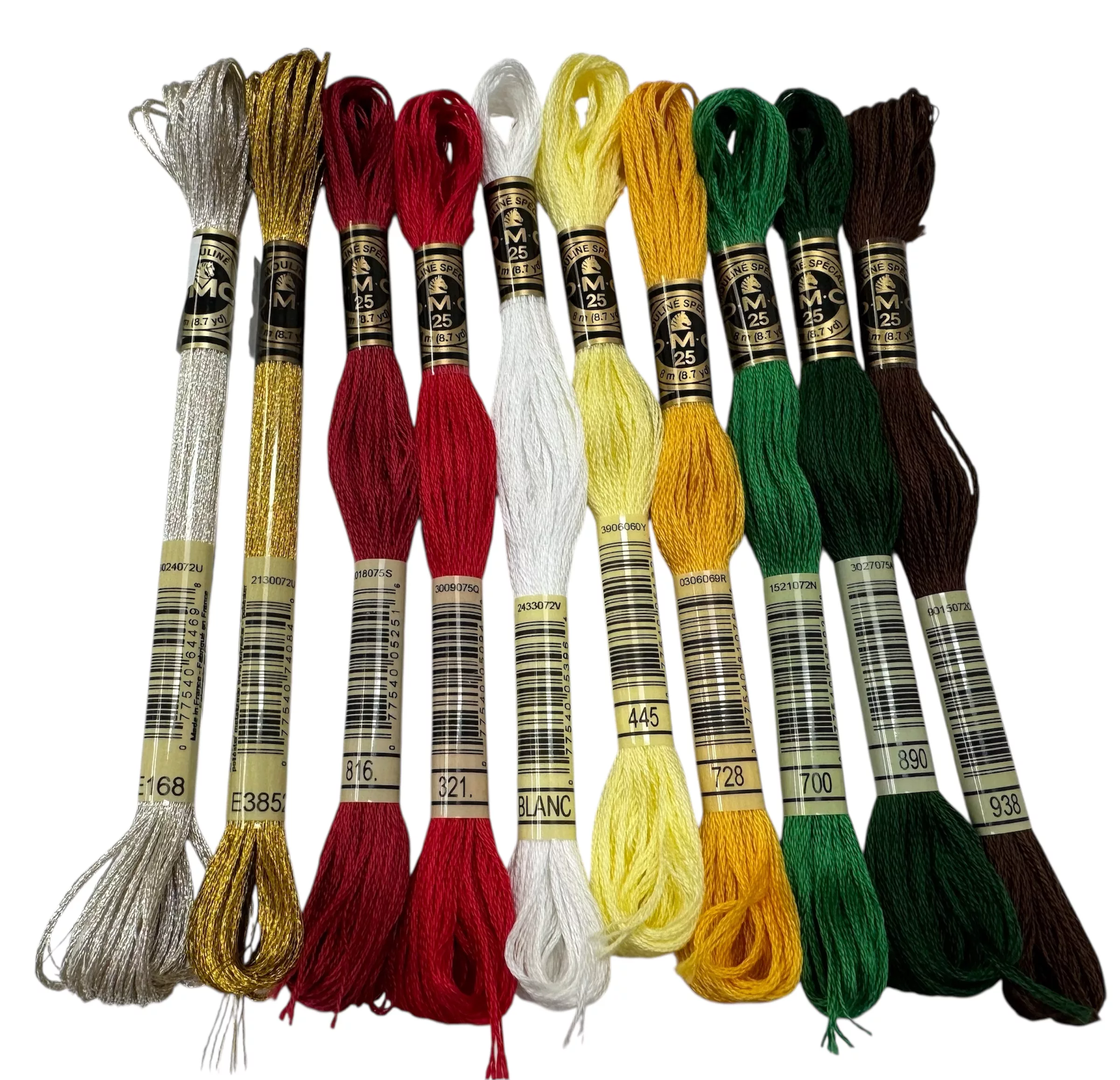 DMC Embroidery Thread set, consisting of 10 different 8m length colours. These are ideal for your festive stitching, and include metallic gold & silver.