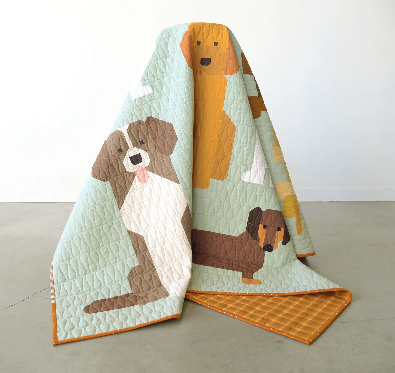 The pattern includes a detailed chart showing the specific fabrics I used to make my samples, but don’t hesitate to make different fabric/color choices! I’ve tried to keep some of the block designs ambiguous enough to be interpreted as different types of dogs, so you can have fun mixing and matching fabrics to make blocks that look more like your own furry friends.
