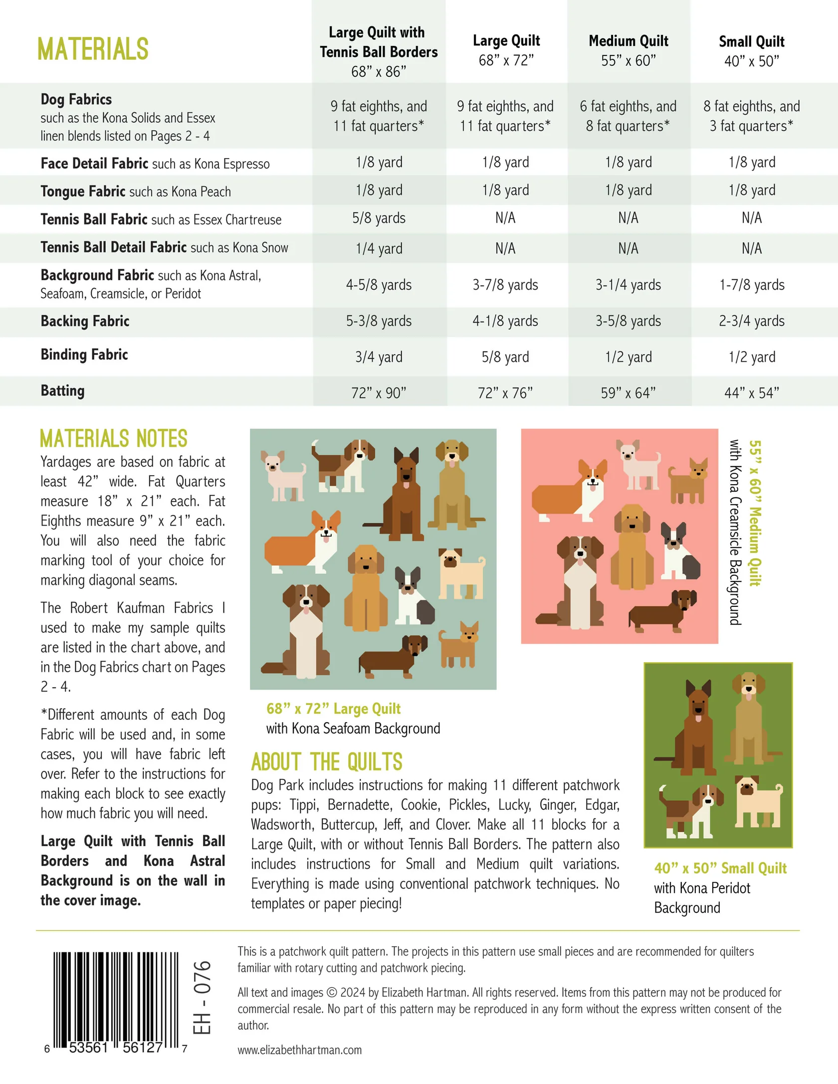 Dog Park includes instructions for making a 68” x 86” Large Quilt with Tennis Ball Borders, a 68” x 72” Large Quilt, a 55” x 60” Medium Quilt, and a 40” x 50” Small Quilt. Please refer to the pattern back image for more details.
