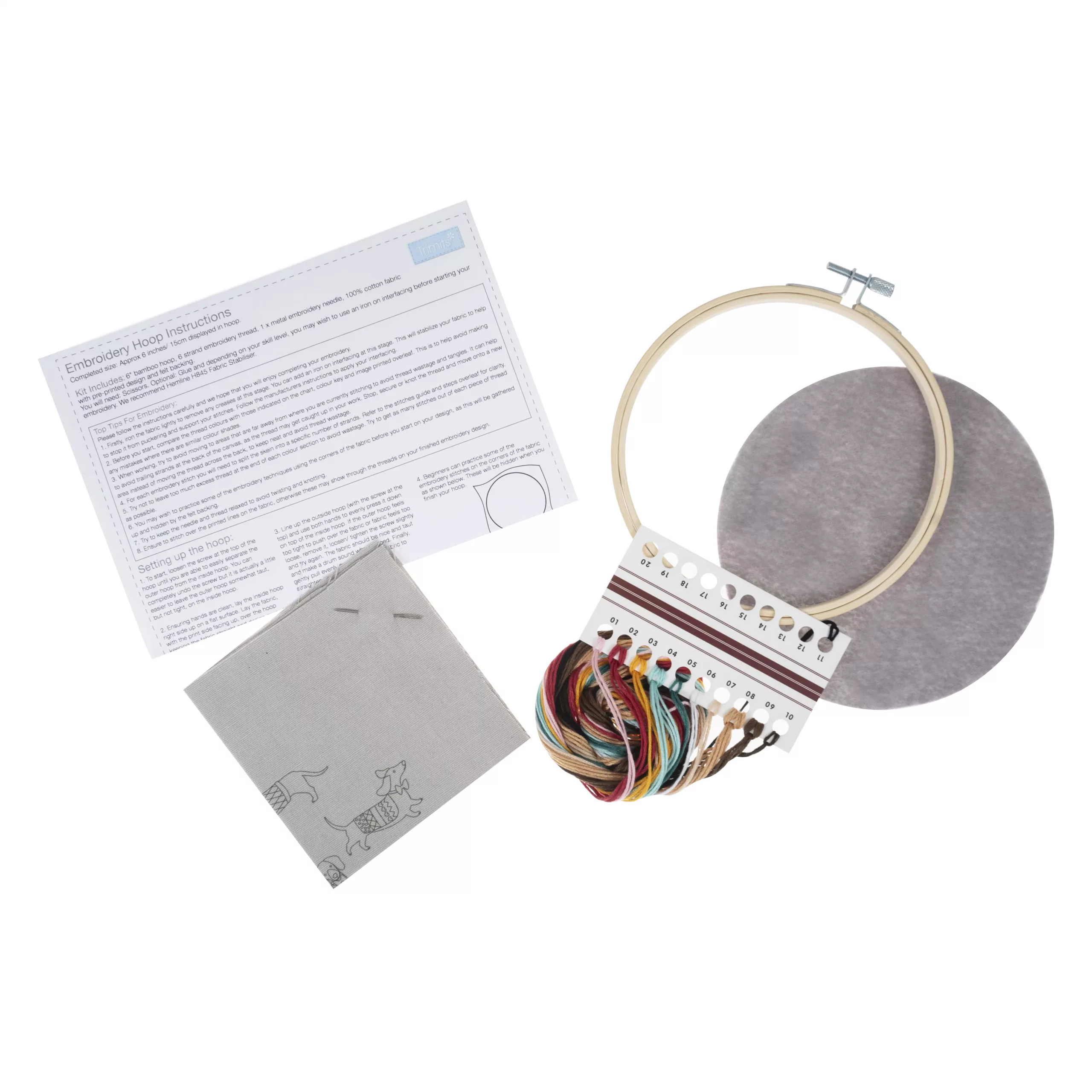 Embroidery kit with hoop. Kit Includes: 15cm bamboo hoop; 6-strand, polyester embroidery threads; 1 x metal embroidery needle; 25 x 25cm cotton fabric with pre-printed design; felt backing and full colour instruction sheet. Instructions in 3 languages (EN/FR/DE). Approximate finished size: (diam) 15cm or 6in
