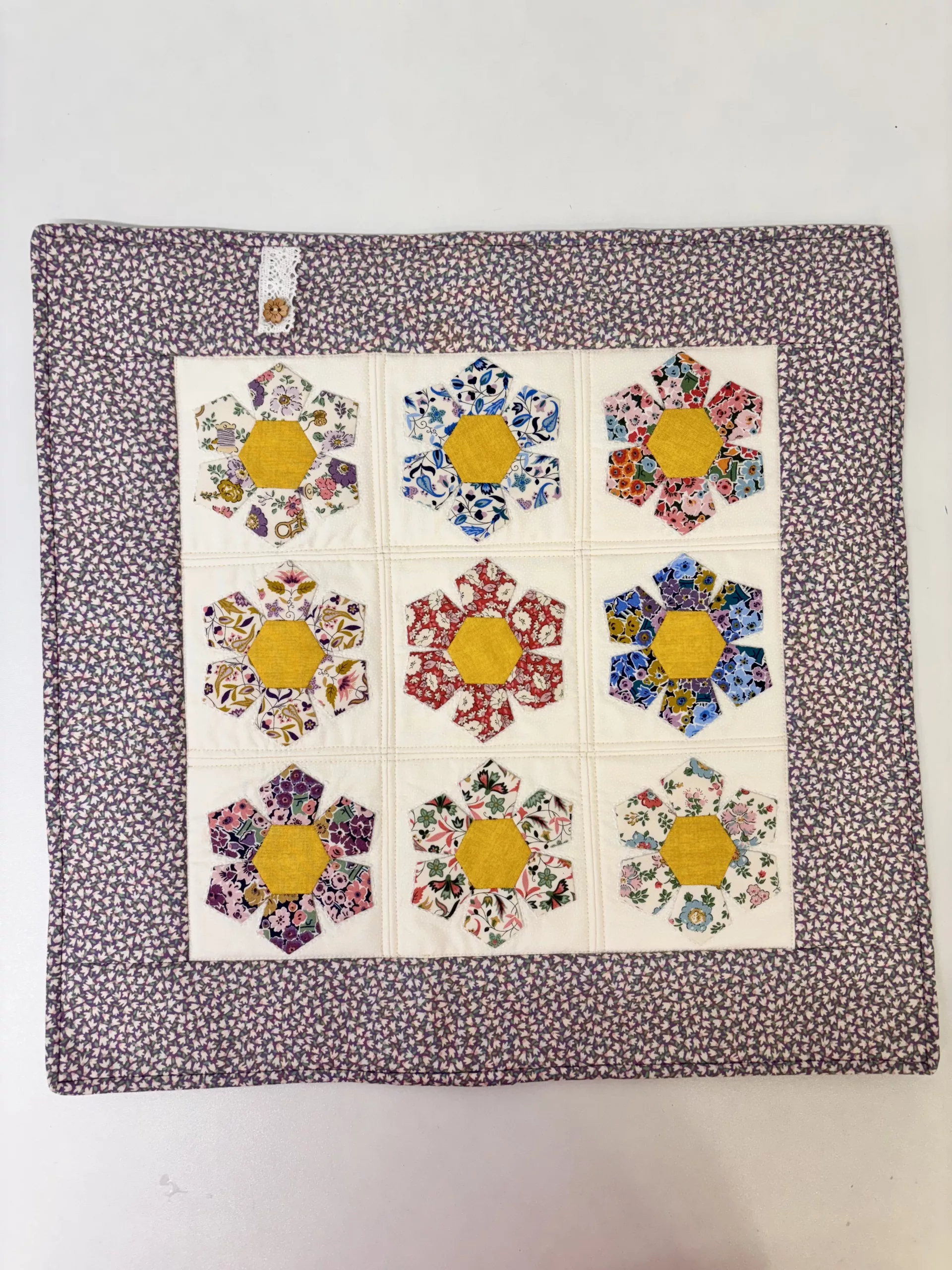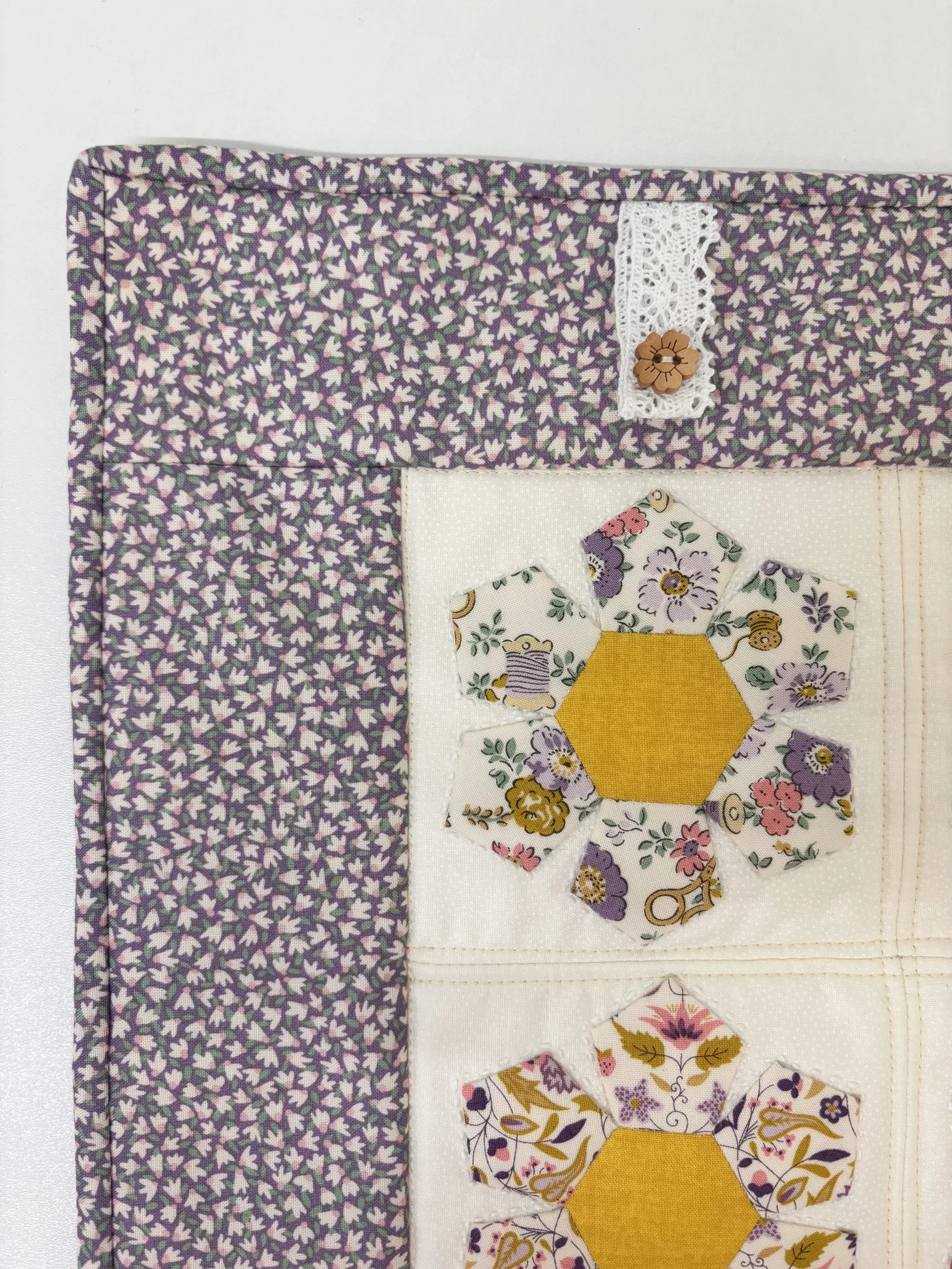Create this mini floral wall hanging using ‘Hexiform’ shapes and a quilt-as-you-go technique. A simple and mindful piece of sewing that makes an ideal gift.