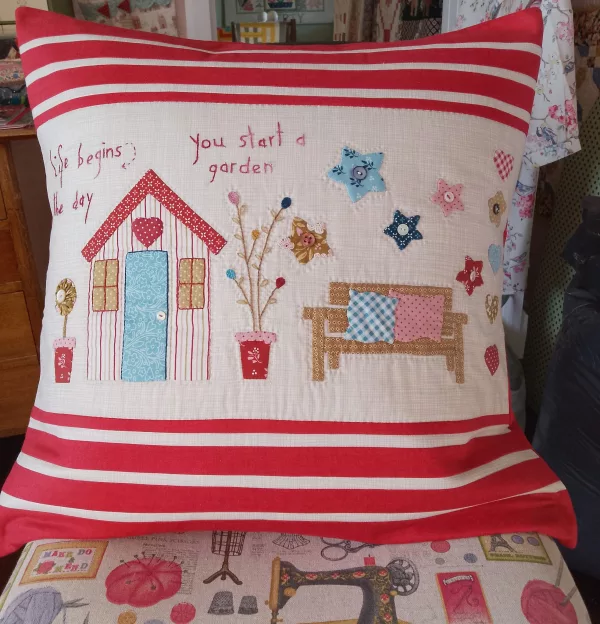 This pattern was made by the lady who owns Quilt Studio Het Gooi in the Netherlands and she kindly gave us permission to teach it. The cushion is perfect for your favourite outdoor chair. The applique can be done by hand or machine. We will teach you how to do the applique, embroidery, how to sew the borders to get a nice striped effect and to sew the back of the cushion.