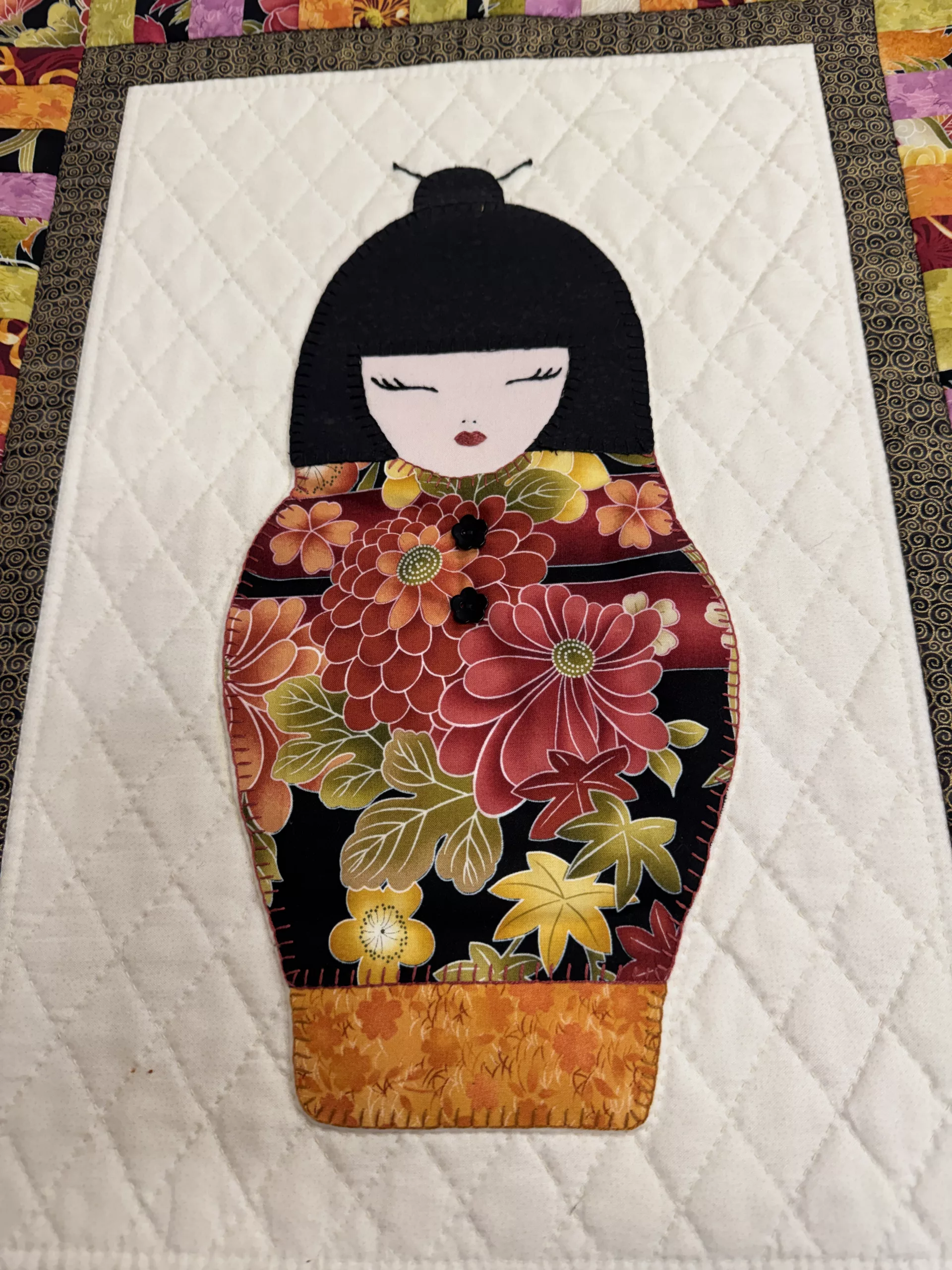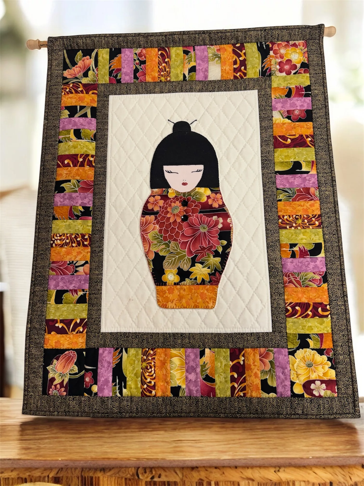 A lovely Japanese inspired wallhanging featuring a Geisha doll appliqué.