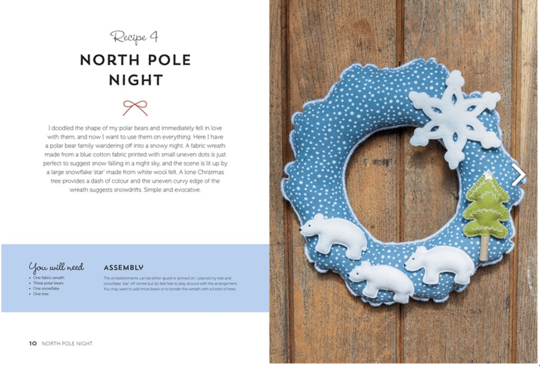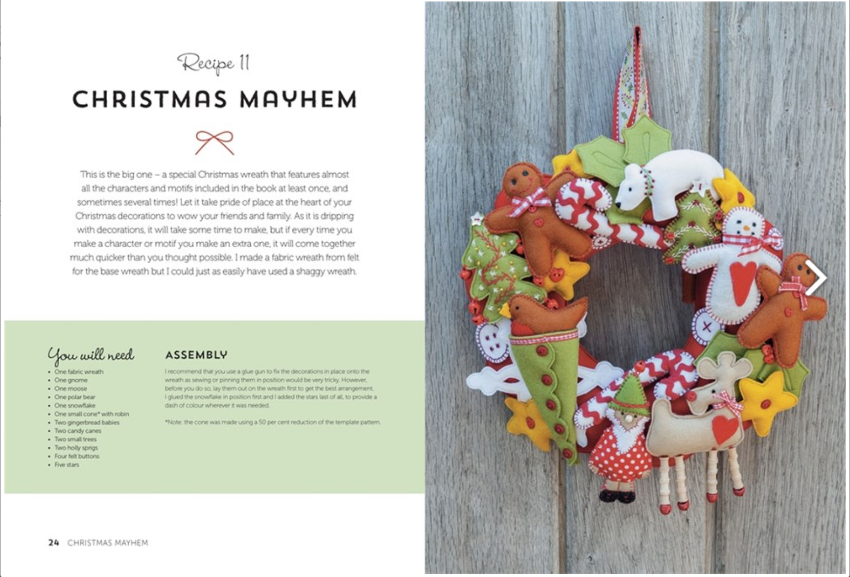 The instructions show Mandy’s quick and clever way to stitch her felt characters which can also be used to create individual Christmas decorations for the tree as well as being used to decorate the wreaths and garlands. With this simple technique you can create lots of festive decorations in no time.
