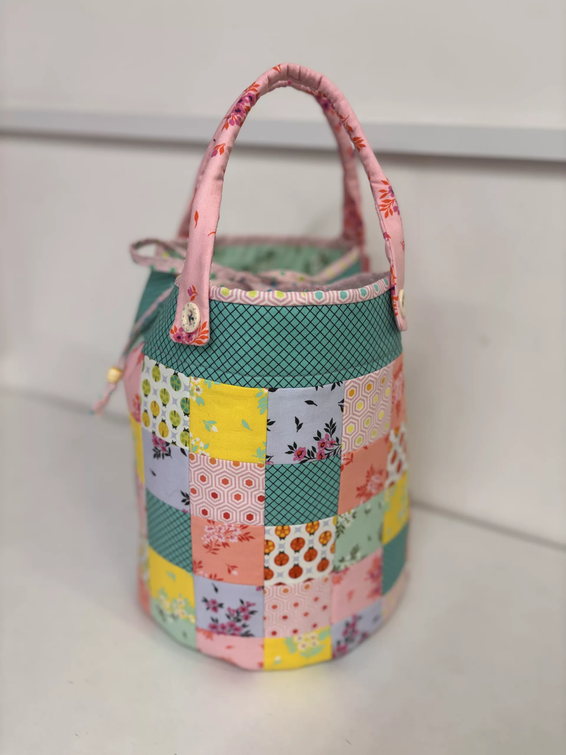 Clear instructions on how to make this beautiful bag. The patchwork outer and rounded shape make for a really unique bag which is lovely as a handbag or to keep projects or wool in.