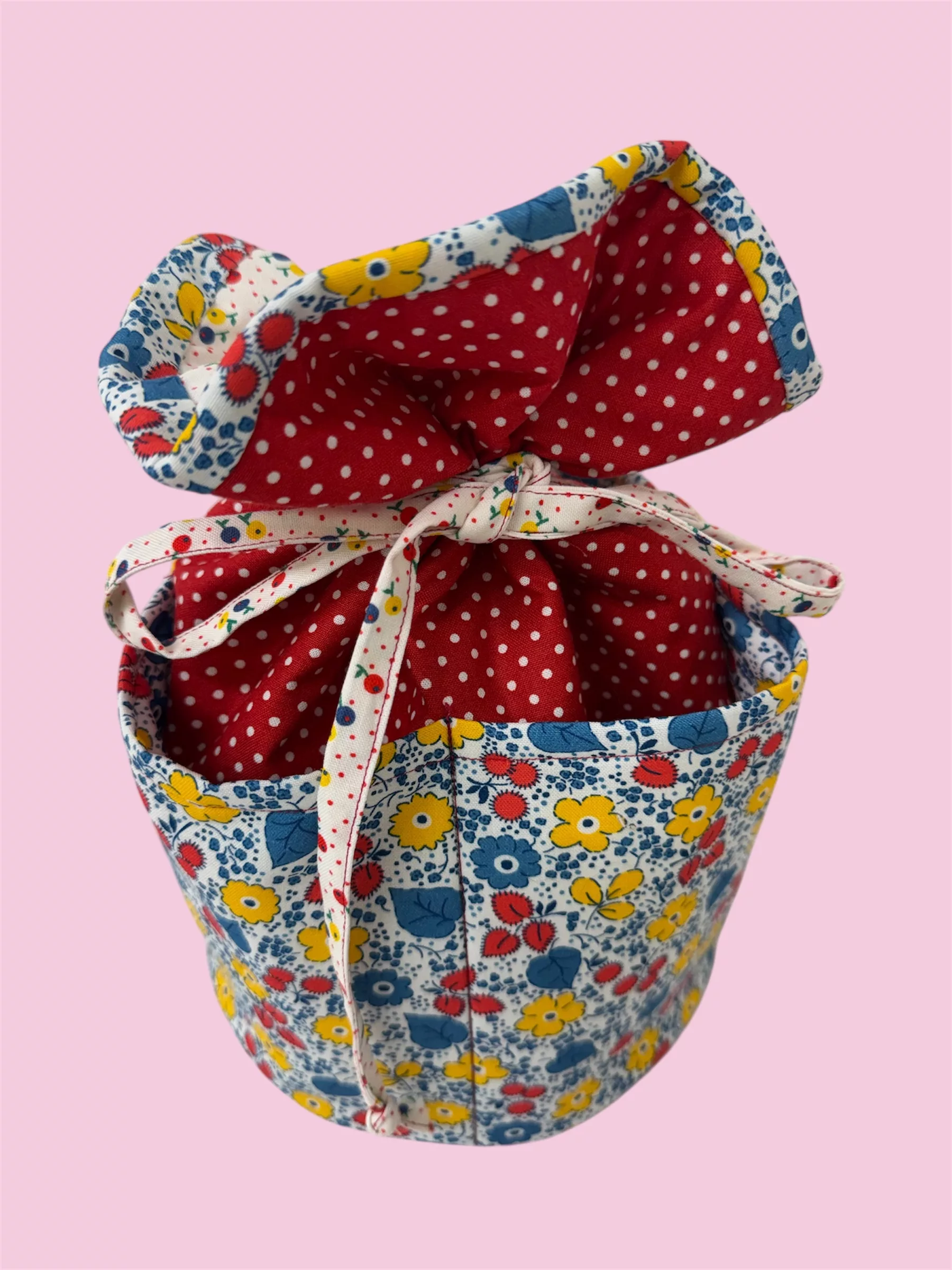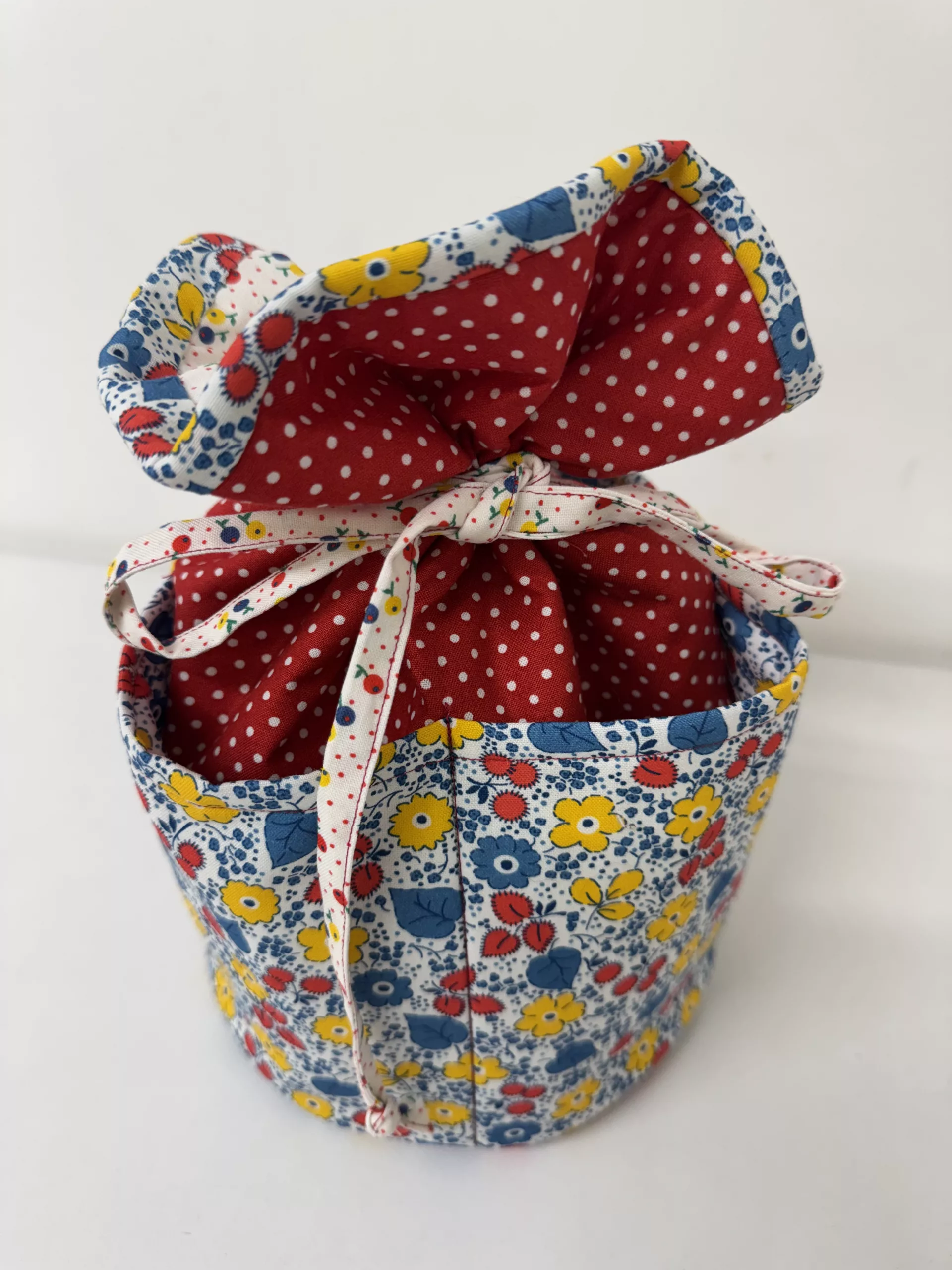 A very useful bag that was initially designed to hold all your sewing tools and small sewing projects, however, it also works very well as a makeup bag. Lots of pockets on the outside as well as on the inside and an easy tie to close.