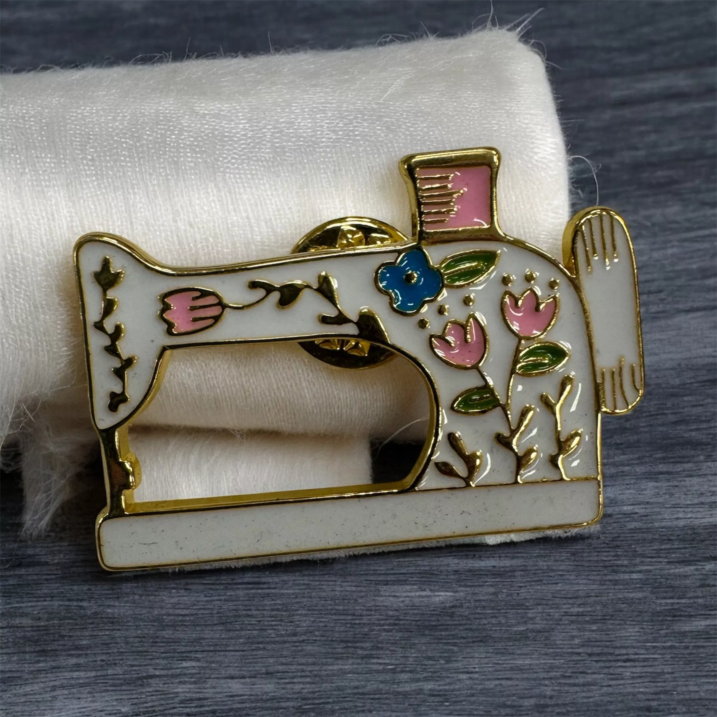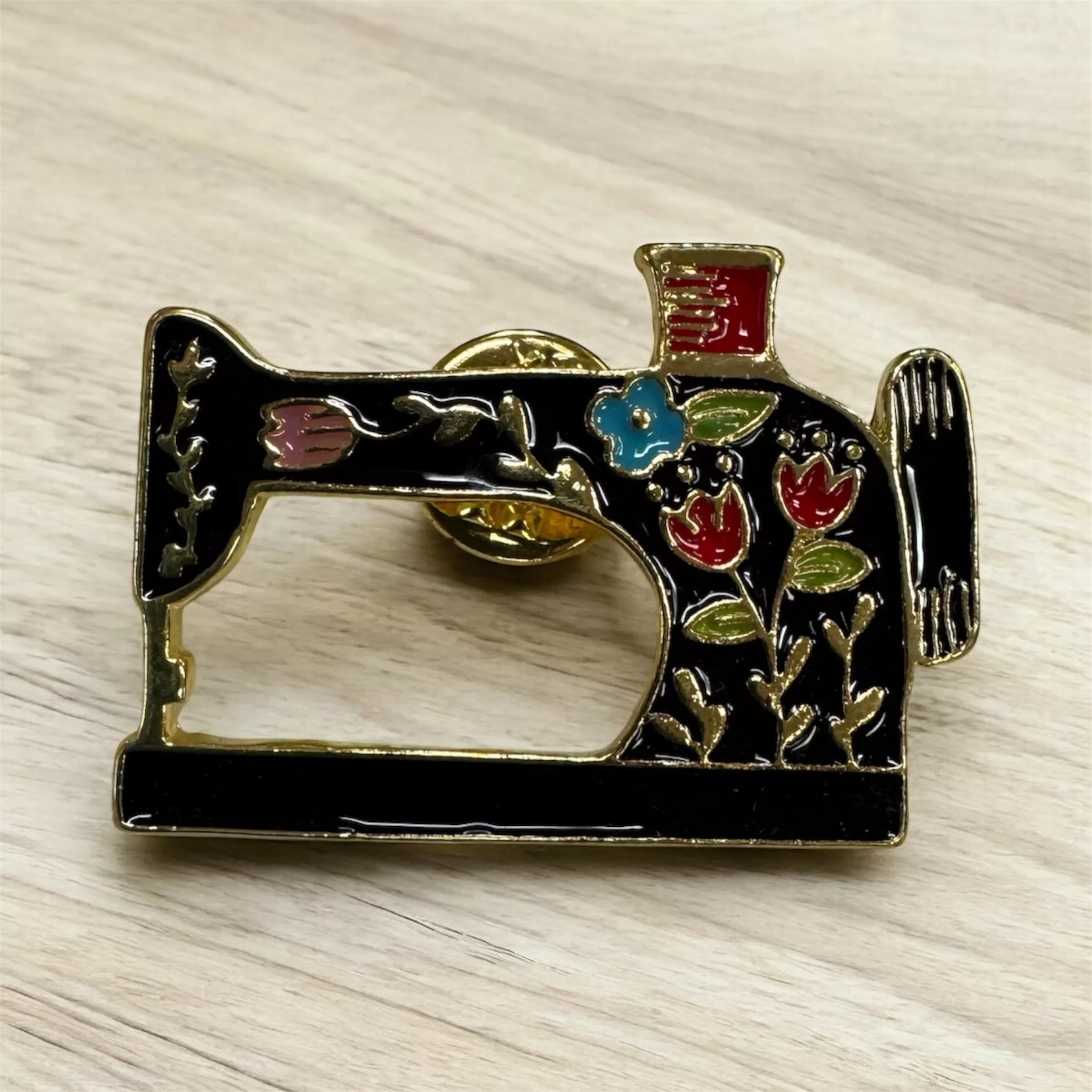 Metal brooch in the shape of a vintage sewing machine and decorated with flowers. Measures approx. 4cm x 3cm. A lovely gift for any sewist.