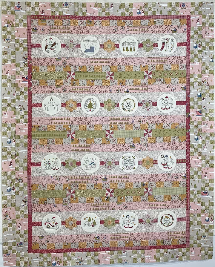 This quilt has 16 stitchery designs featuring Elves and other Christmas Critters, easy piecing and a little EPP with hexagon flowers. The pattern includes the 16 stitchery designs and all instructions to make the quilt.