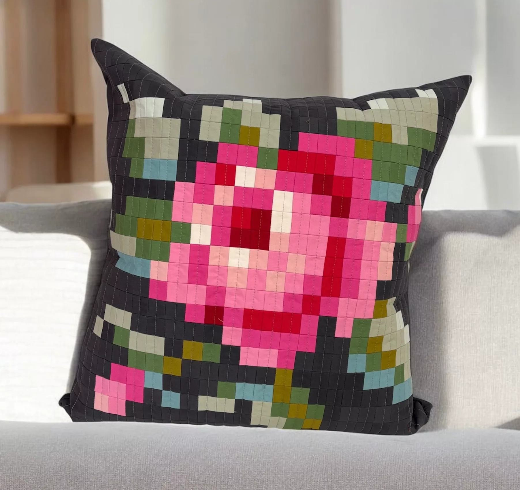 There is quite a bit of work to make this pillow but I’m sure you can agree, it’s well worth it. The pillow is finished off with an envelope back and 5 self-cover buttons. Rotary cutting experience is a must for this class.
