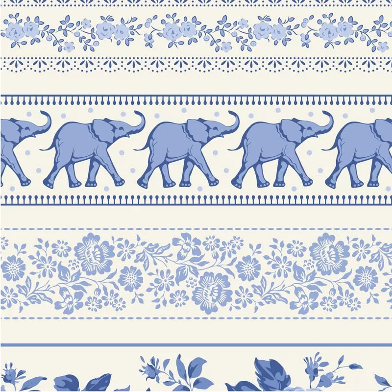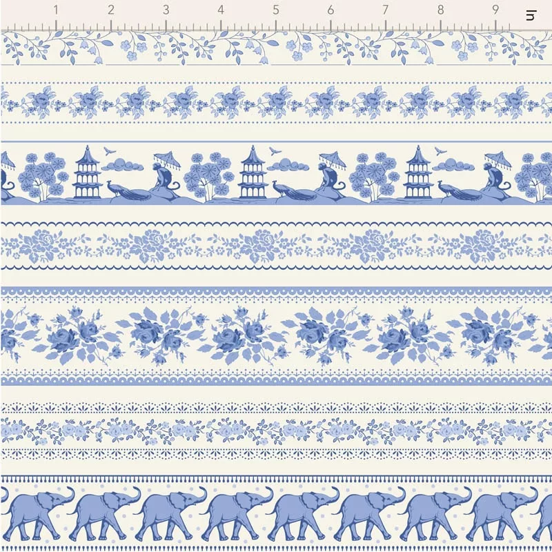 Something Blue has 15 different pattern designs, some repurposed and some new. Most of them are offered in dark-on-light and light-on-dark, to create two colorways. A fun addition to the main collection and blenders are the border fabrics, which allow you to create more realistic patchwork pottery. There is also a fun design with quilt labels and ornaments for decorations in two colorways.
