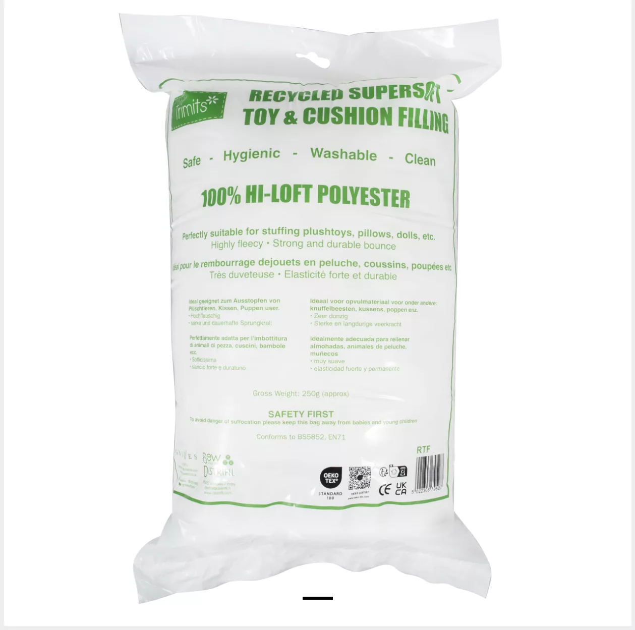 Soft, clean and washable, made from recycled polyester. Complies to BS5852 British flammability test. Valid cleanliness certificate & EN71-3 European standards certificate. Ideal for toy and cushion filling as well as other sewing projects.